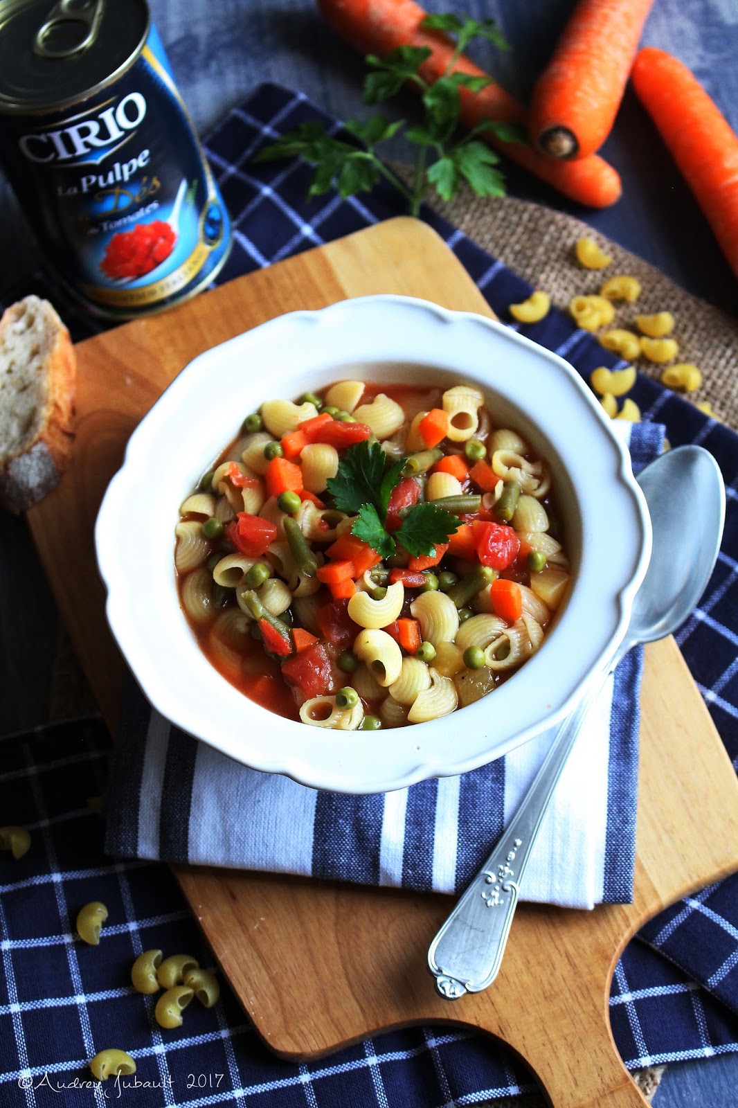 J'ai réalisée ce Minestrone à ma façon avec des petites pâtes "Piccolini", des haricots verts, des petits pois, des carottes, un navet Boule d'or et de pulpe de tomates, un minestrone totalement végétarien.