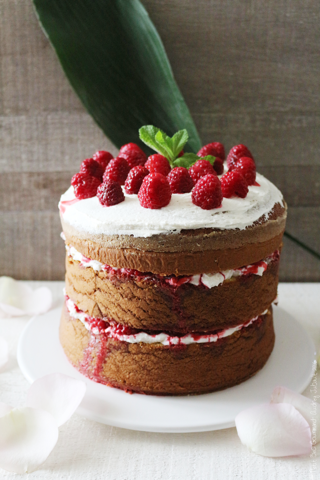 Les disques de biscuits sont imbibées d'un sirop de Framboise & Rose, nappés de crème chantilly-mascarpone légèrement sucrée.