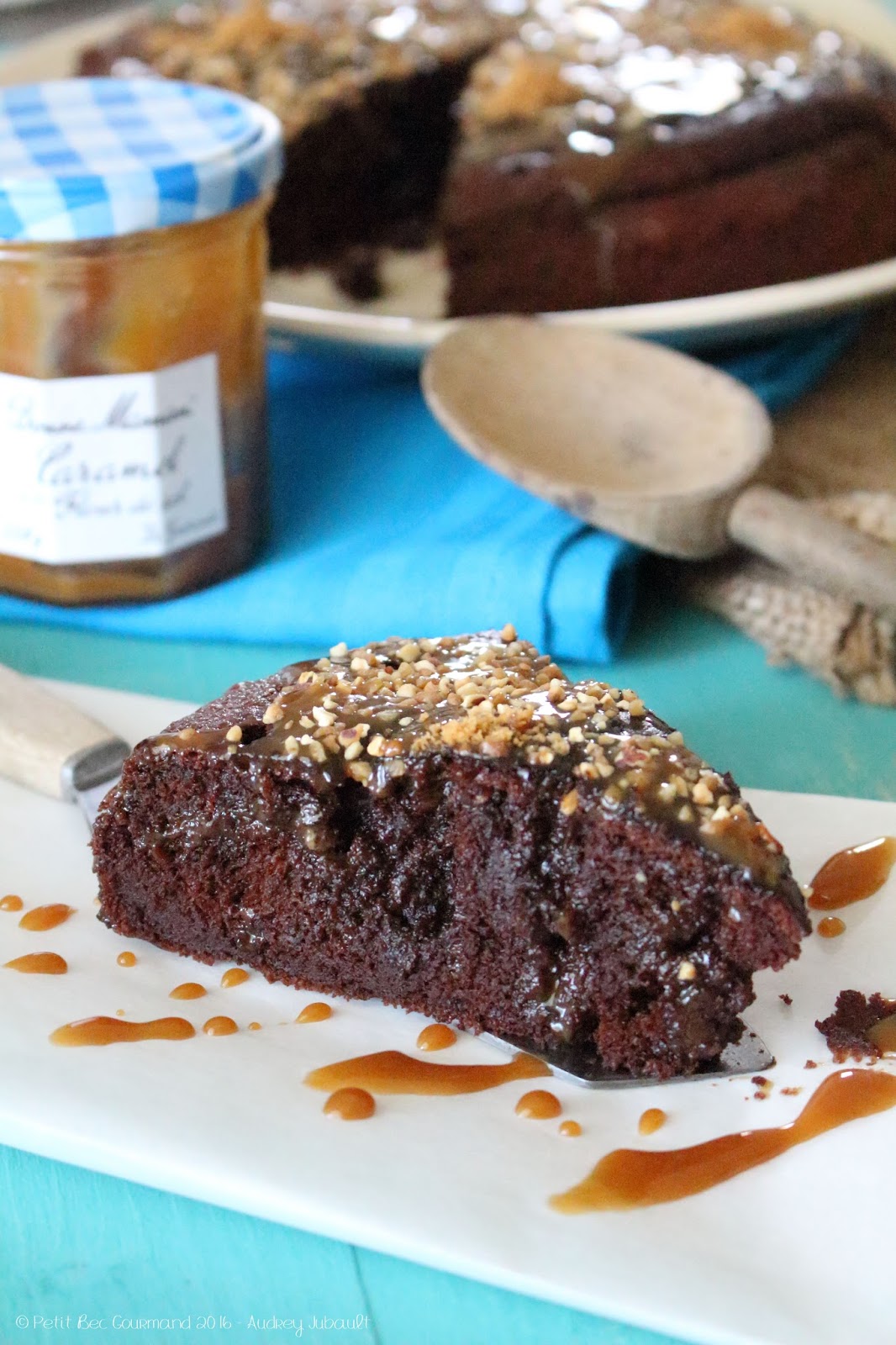 A défaut de piquer le gâteau avec un couteau, j'ai utilisé un pique en bois assez épais, et je fais couler le Caramel à la Fleur de sel de Bonne Maman (que j'ai reçue dans la DEGUSTABOX de Septembre) dans les petits trous, je réalise souvent cette astuce lorsque je le fais en version chocolat coulant.