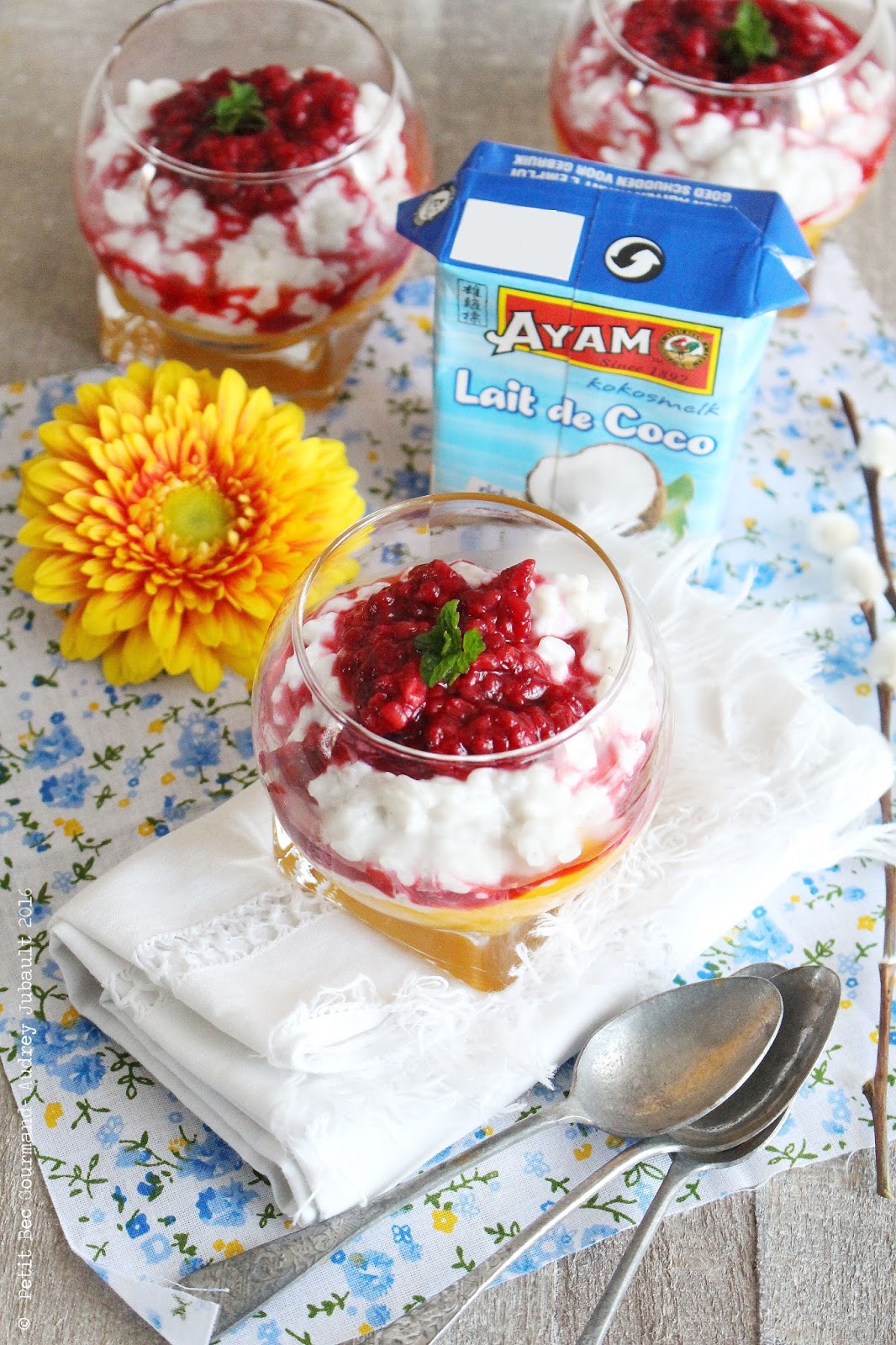 Riz au Lait de coco, Purée de mangue et Brisures de framboises