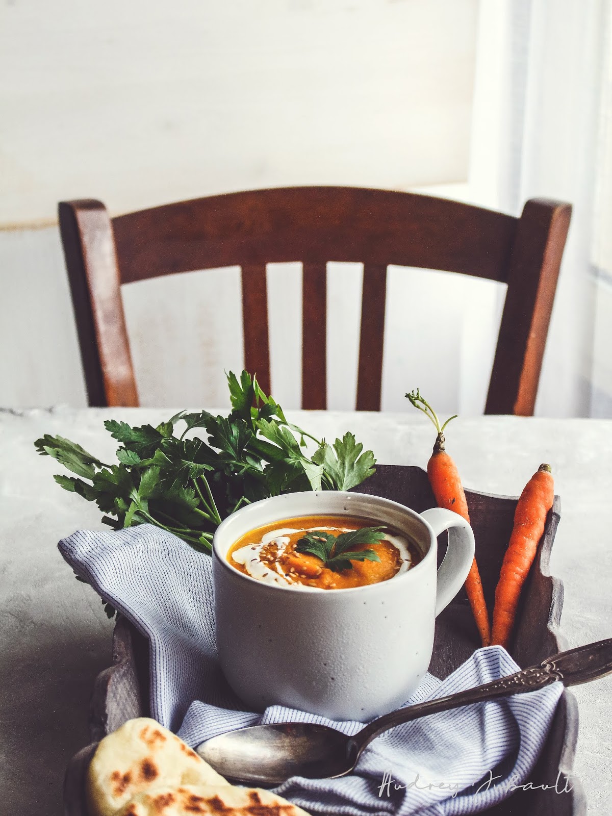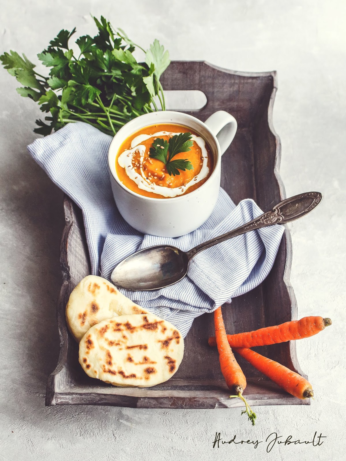 Pour rester dans le végétal, une bonne petite crème d'avoine a apportée une texture hyper douce et un peu de curcuma pour apporter une note indienne et on accompagne cette soupe de naans nature (mais on peut aussi les faire au fromage).