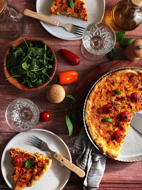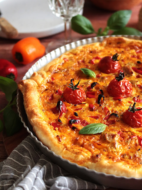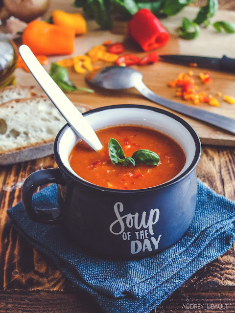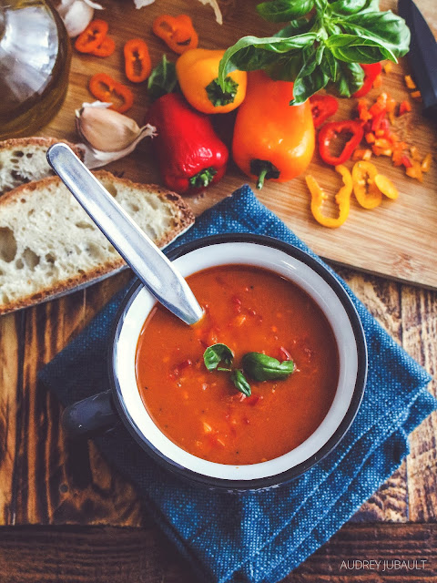 Légère et colorée, comme une envie de voir l'été se prolongeait encore dans notre assiette mais le présent nous rattrape avec le froid automnal ; cette délicieuse soupe un peu relevée par les poivrons colorés et quelques tomates pelées du garde-manger nous a permis de nous réchauffer les papilles.
