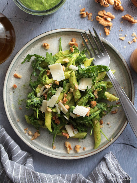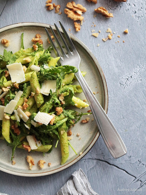 Un succulent plat de Penne enrobés d'une sauce pesto très crémeuse faite avec de la roquette, de l'ail, de l'huile d'olive, des olives vertes, du parmesan et de la crème d'avoine. J'ajoute aussi quelques brins de roquette dans les pâtes.
