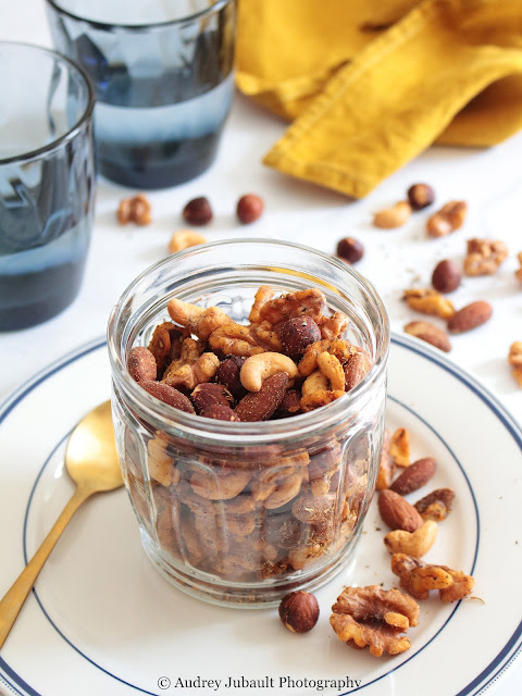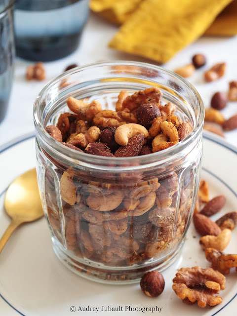 Une recette apéritive facile et goûteuse à réaliser rapidement. Un mélange de fruits secs salé au thym et huile d'olive. Ce qui est bien avec cette recette c'est de pouvoir varier avec les différents fruits secs: noisettes, amandes, cerneaux de noix, noix de cajou, cacahuètes; mais aussi en ajoutant des graines : courges, tournesol ...