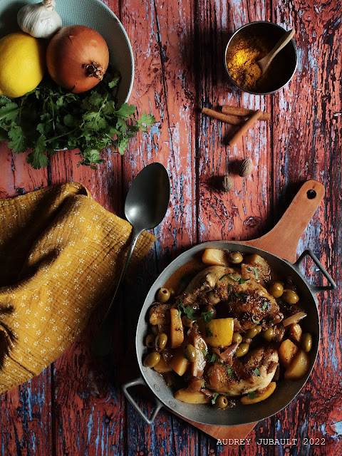 Tajine de poulet, pommes de terre, olives et citron