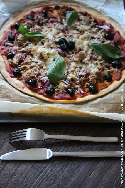 Parsemez de thon, les câpres, l'oignon haché grossièrement et la mozza sur le dessus avec les olives.