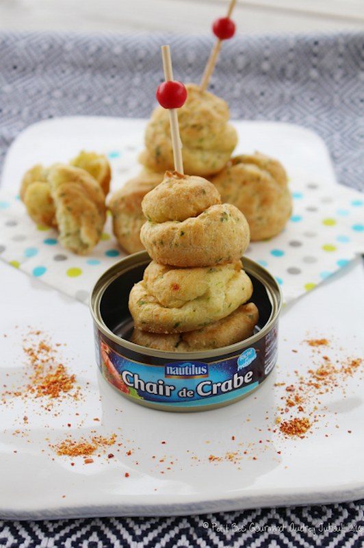 Le petit conseil est de vraiment bien égoutter et presser la chair de crabe afin d'éliminer le plus d'eau, cela permettra aux gougères de bien gonfler et de ne pas être imbibées d'eau.