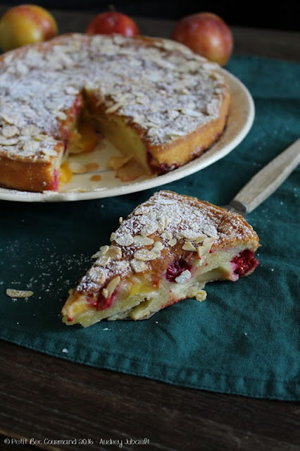 - Posez-les sur votre pâte, de même pour les framboises (de mon jardin que j'avais mis au congélateur), parsemez d'amandes effilées et enfournez pour 25 min de cuisson.
