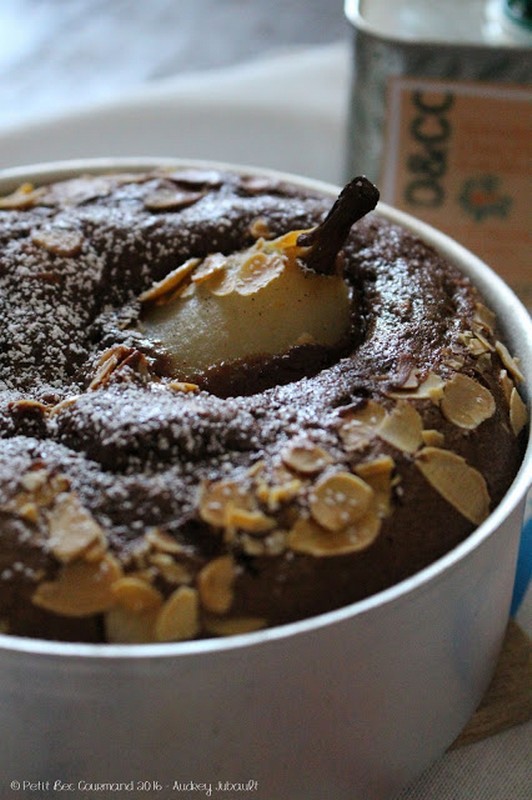 Un bon moelleux au chocolat, une petite poire au sirop maison et un peu d'huile d'olive à la mandarine font de ce gâteau un réconfortant à coup sûr.