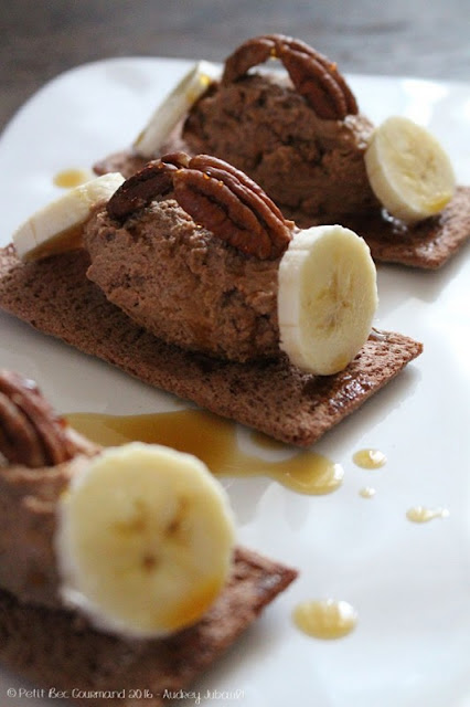De simples Tartines craquantes Bio au cacao, une mousse chantilly au chocolat-praliné ( on dirait même une légère petite mousse au chocolat), de petites rondelles de bananes, des noix de pécan et un filet de sirop d'érable.