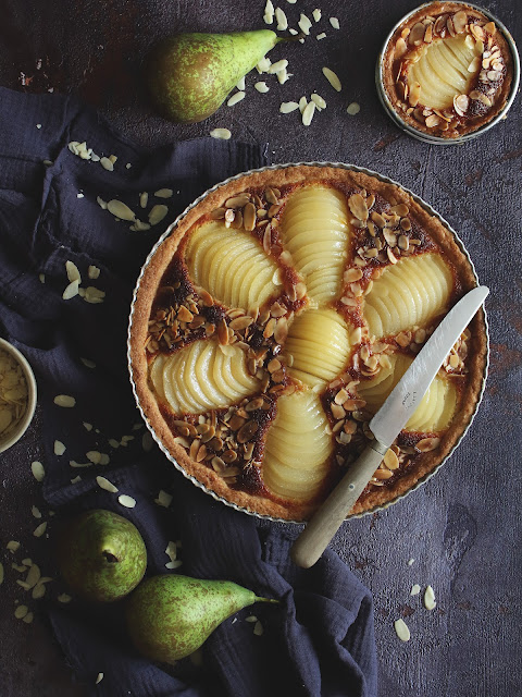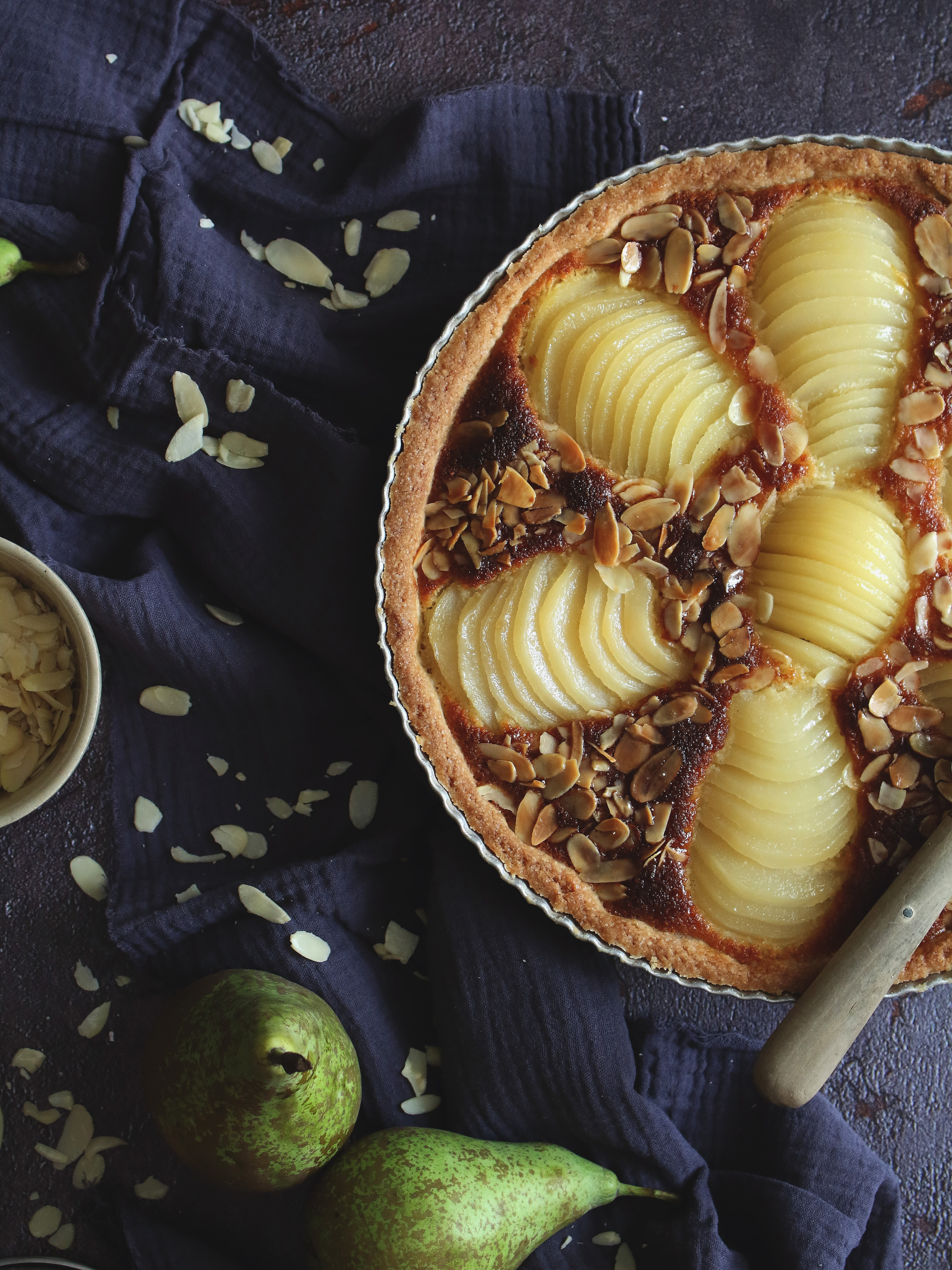- Etaler la préparation aux amandes sur la pâte. Ajouter les poires tranchées comme sur les photos.