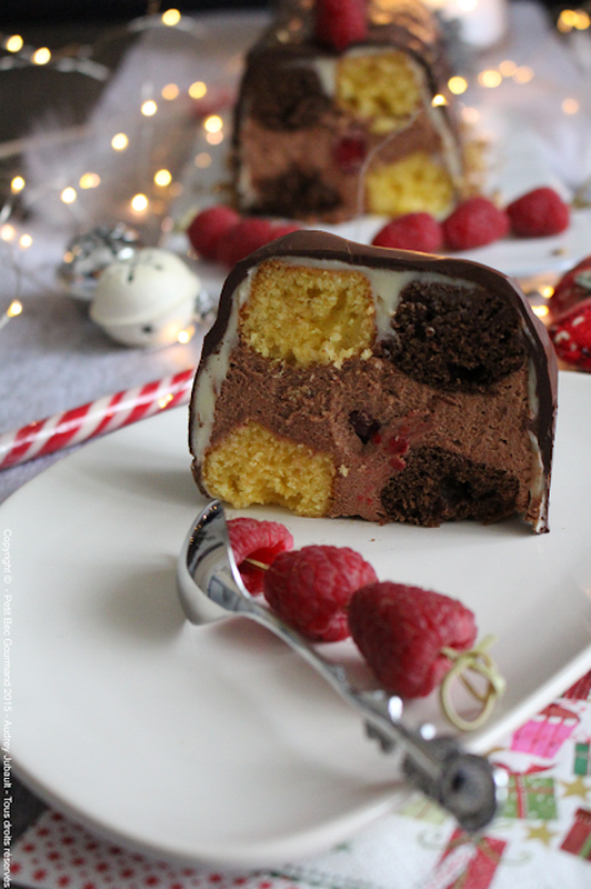J'ai réalisée un lingot au Chocolat noir craquant, une ganache au chocolat blanc, suivie d'une mousse légère au chocolat légère, des framboises au centre et les Pockets Nature et Chocolat.