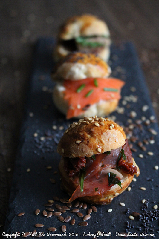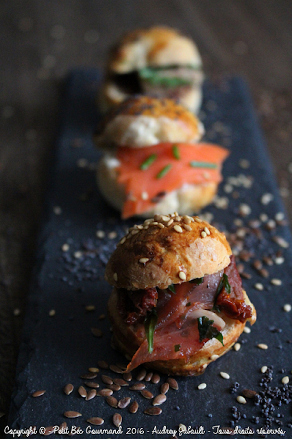Une super idée apéritive que j'avais faite pour le nouvel an (et dont je poste l'article un peu tard), des "Little Burgers" garnis de différents ingrédients :*saumon sauvage-boursin-graines de pavot, *foie gras aux figues-confiture de figues- roquette-graines de lin, *jambon d'Aoste-tomates confites-roquette-graines de sésame