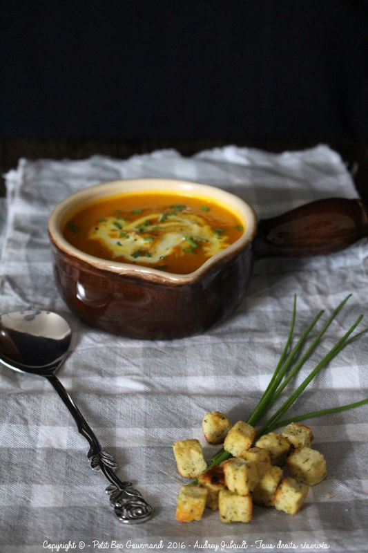 Brrrr, je sais pas pour vous mais ici c'est un bon velouté de Carottes & Patates douces agrémenté de curry, de cumin, de lait de coco et d'un soupçon de crème fraîche qui va nous réchauffer.