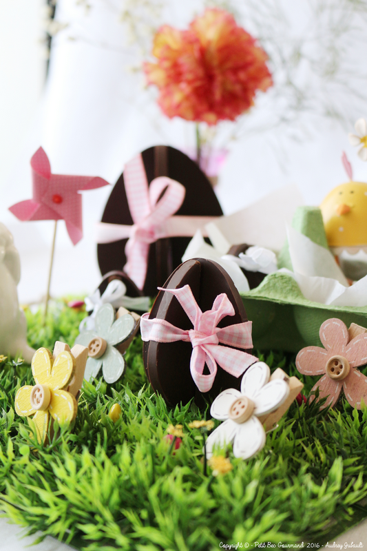 - Démouler et former les oeufs grâce aux petites encoches, décorer d'un joli ruban et voilà vos Oeufs au chocolat de Pâques.