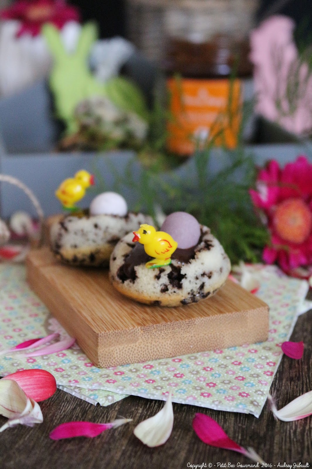On n'en ferait vraiment qu'une bouchée de ces "Petits nids de Pâques" qui sont de minis financiers marbrés au chocolat vermicelle et fourrés à la pâte à tartiner CHOCOMIEL Clémentine de la Famille Mary.