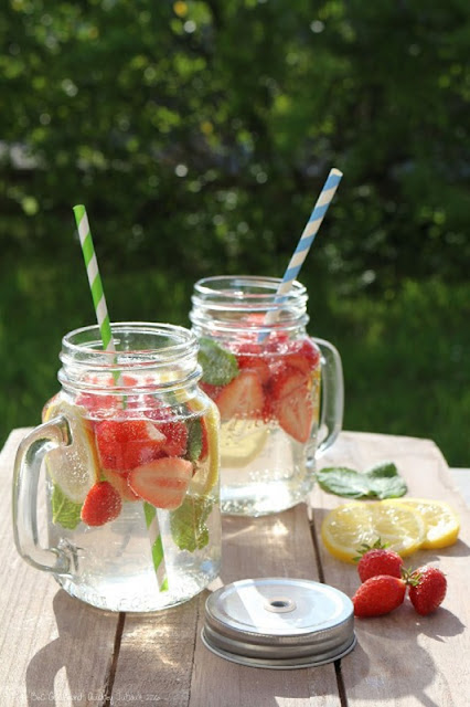- Dans chaque jars, mettez 60g de fraises, 3 rondelles de citron et 3/4 feuilles de menthe et ensuite 300ml d'eau minérale pétillante (ou plate).