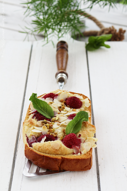 J'ai craquée sur le marché pour quelques framboises car j'avais une nouvelle recette en tête (du moins le croquis était fait), je n'ai pas réalisée la brioche mais il me restait de grandes tranches de "La Boulangère", une petite crème d'amandes, quelques amandes effilées et le tour est joué.