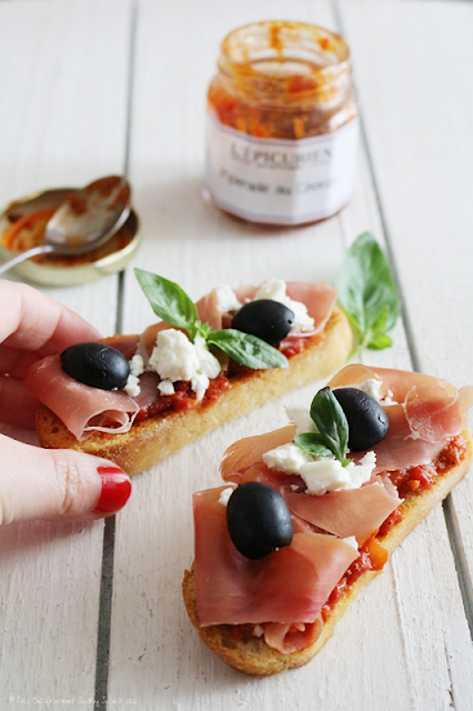 - Tartinez de Piperade au Chorizo, dressez le jambon cru (1 tranche / bruschettas car elles sont très fines), émiettez ensuite un peu de feta, décorez de petites feuilles de basilic et d'olives noires.