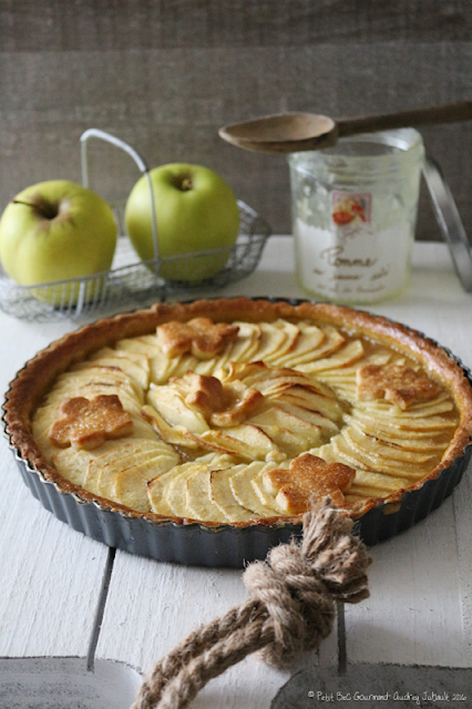 On adore la tarte aux pommes mais celle-ci à un goût d'exception, j'ai utilisée le pot de Pommes au beurre salé au sel de Guérande (reçu dans la Degustabox du mois d'Avril), une pâte sablée aux amandes, de fines tranches de pommes et un nappage à la gelée de pommes.