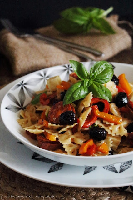 Profitons de quelques rayons de soleil pour se faire plaisir dans l'assiette avec cette Salade de pâtes, agrémentée de poivrons, de chorizo, d'olives noires et d'une Sauce Salade Balsamique sans huile.