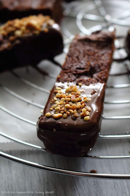 J'ai voulu une présentation différente des cookies habituels ronds et plats, en "finger"; à trempouiller dans le chocolat et parsemé de pralin, c'est une véritable douceur.