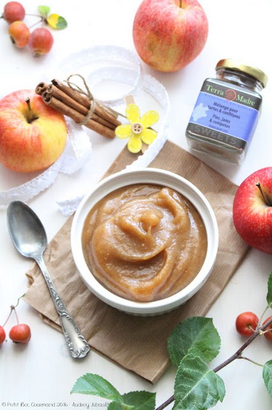 Le temps pour moi de réaliser une délicieuse Compote de pommes automnale agrémentée d'un doux "Mélange d'épices pour Tartes & Confitures" de chez Terra Madre (Vanille, Gingembre, Muscade et Cannelle).