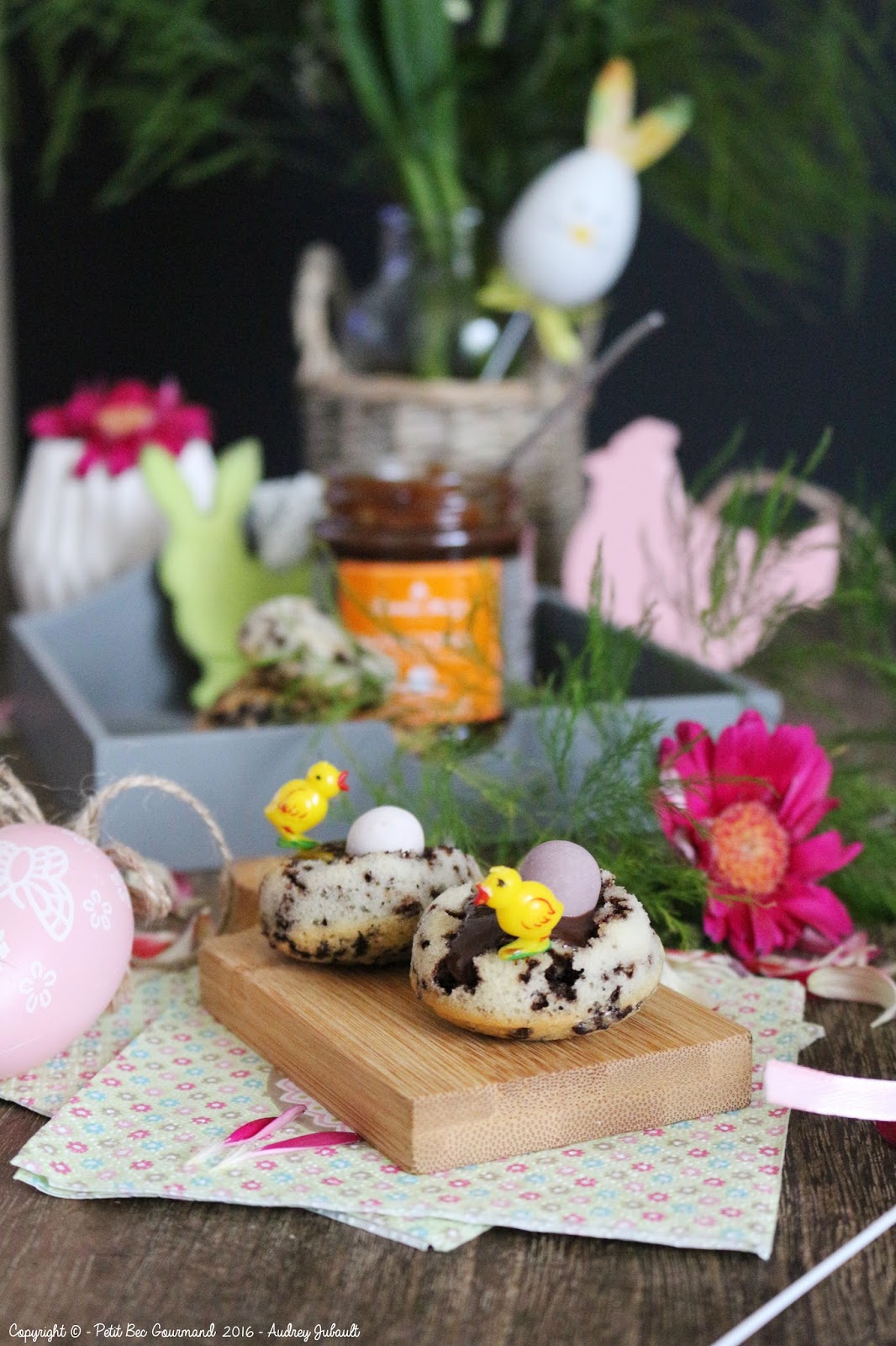 On n'en ferait vraiment qu'une bouchée de ces "Petits nids de Pâques" qui sont de minis financiers marbrés au chocolat vermicelle et fourrés à la pâte à tartiner CHOCOMIEL Clémentine de la Famille Mary.
