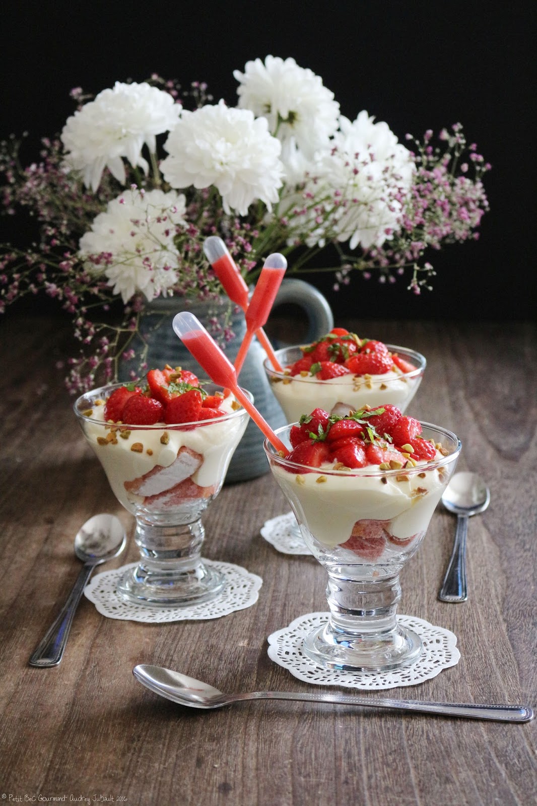Des Fraises, des fraises et encore des fraises..... Une recette simple, fraîche et savoureuse, des gariguettes,une crème mousseuse au mascarpone & citron, quelques zestes de citron, de minis biscuits roses Fossier, de menthe ciselée , le tout accompagné d'une pipette de coulis de fraises.
