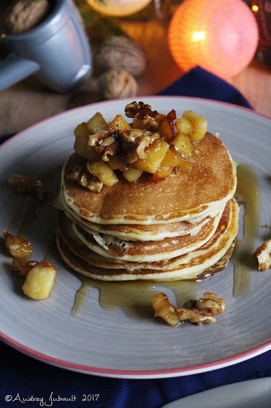 - Pour le dressage, empilez quelques pancakes, ajoutez le mélange pommes et noix et dégustez chaud ou tiède.