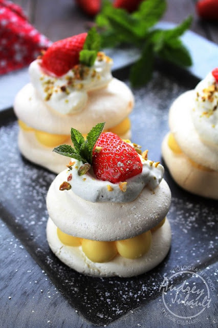 Pour cette fois, j'ai réalisée des {Minis Pavlovas Citron Fraise} en version individuelle pour l'aspect "plus c'est petit plus c'est mignon".