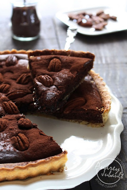 A la maison, nous sommes de grands gourmands, on adore les tartes et les brownies alors pourquoi ne pas associer les 2 pour une seule recette hyper gourmande et fondante:{PECAN BROWNIE PIE}, une pâte sablée à la poudre de noisettes et un appareil à brownie au bon goût de chocolat noir (vous pouvez le remplacer par du chocolat au lait).