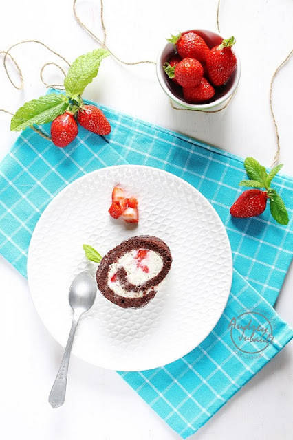 Un roulé moelleux au chocolat garni d'une chantilly vanillée montée avec du mascarpone et de fraises.