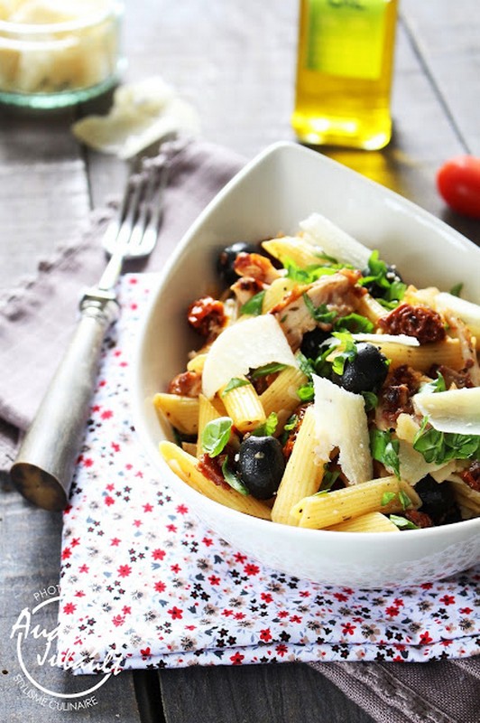 - Dans un saladier, mélangez les olives, le poulet, les tomates confites et les Penne.