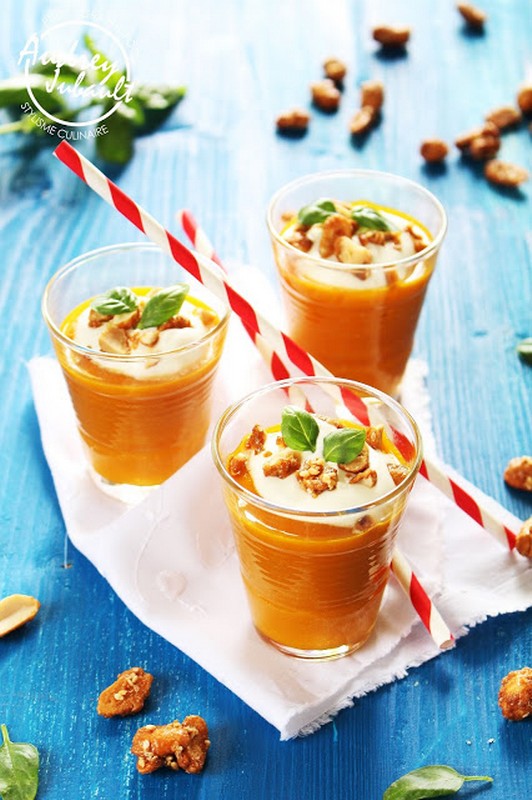 - Dressez dans de petites verrines le gaspacho de carottes, 2 cc de chantilly coco, parsemez de cacahuètes concassées et de petites feuilles de basilic.