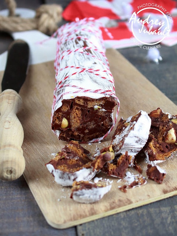 Bien qu'il ait l'apparence d'un bon saucisson, celui-ci n'a pas le même goût car il est fait tout en chocolat avec des morceaux de biscuits speculoos, des amandes et des pistaches.