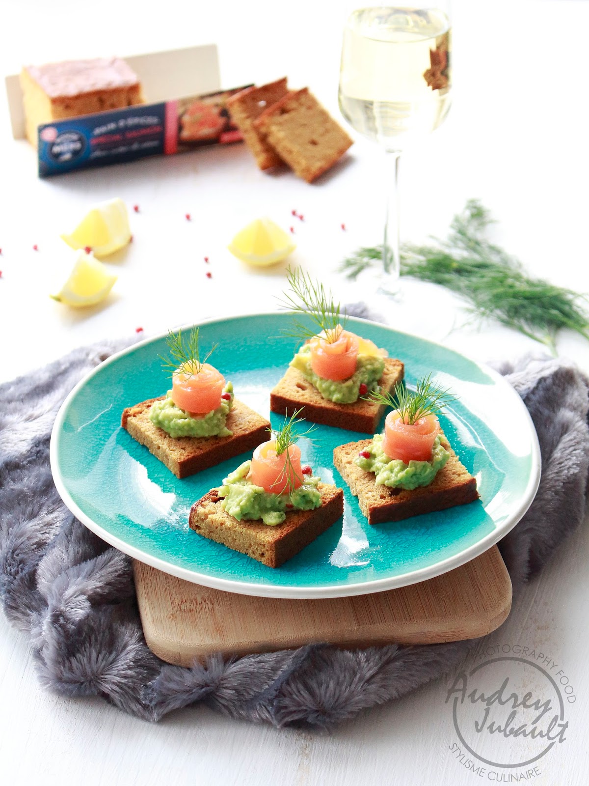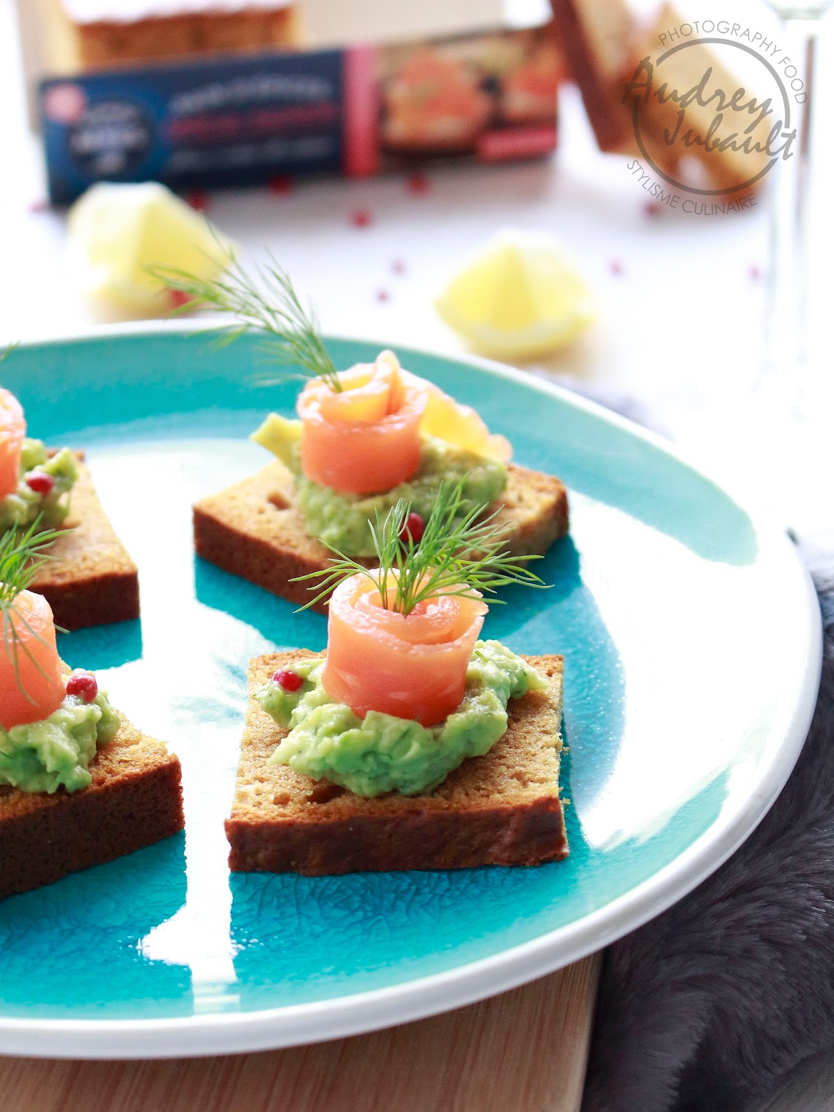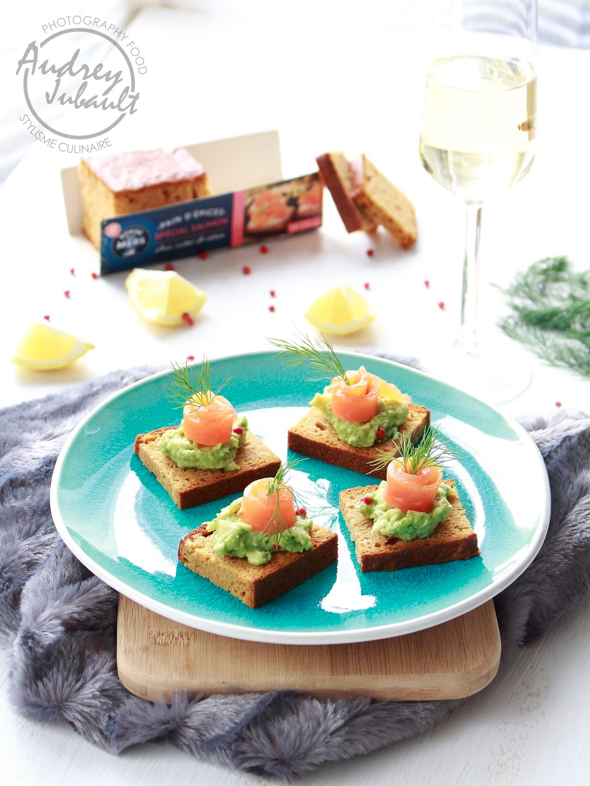 Ce petit amuse-bouche épatera vos invités par l'alliance du pain d'épices au citron, de l'avocat aux baies roses, de lamelles de saumon et d'aneth.