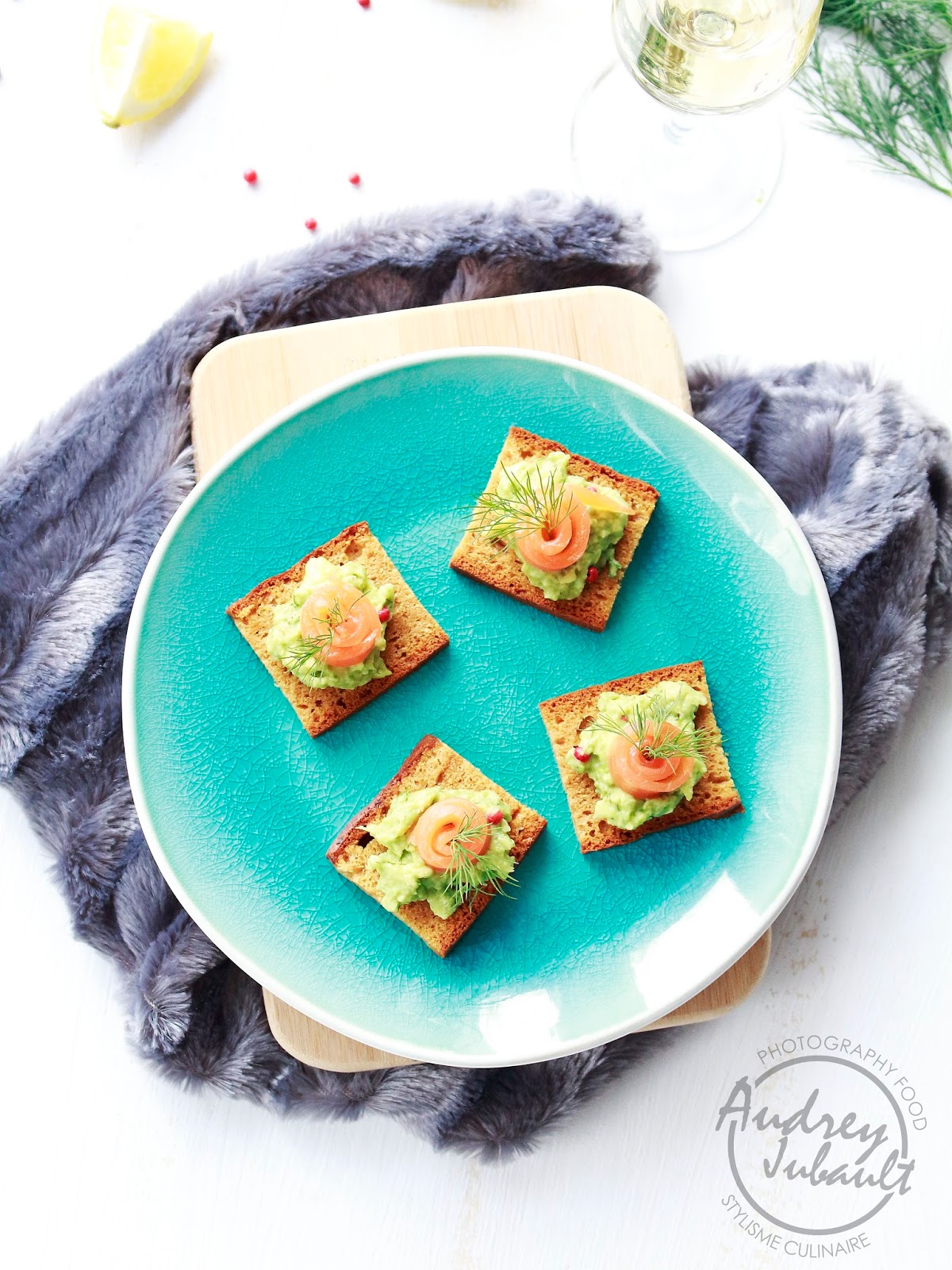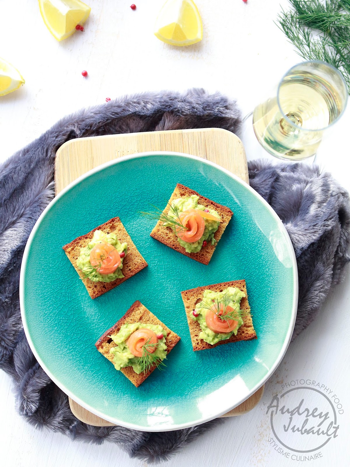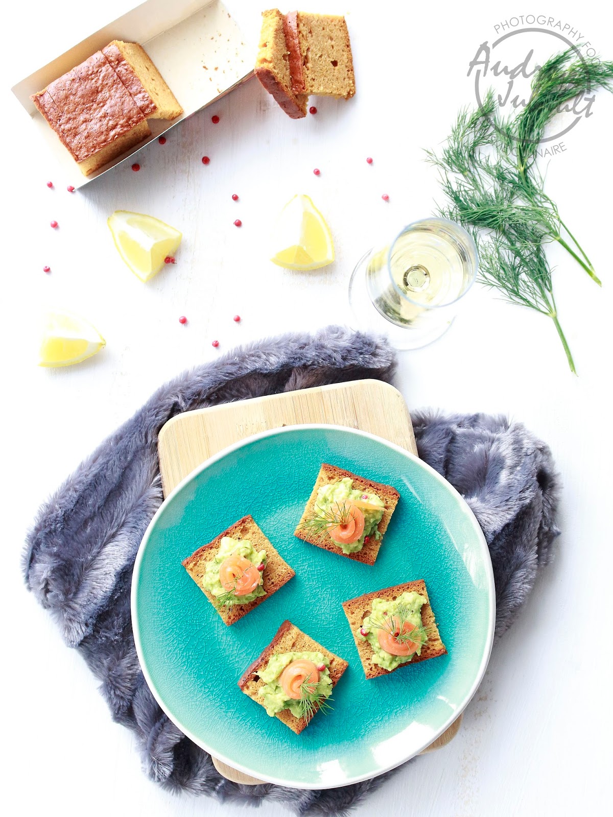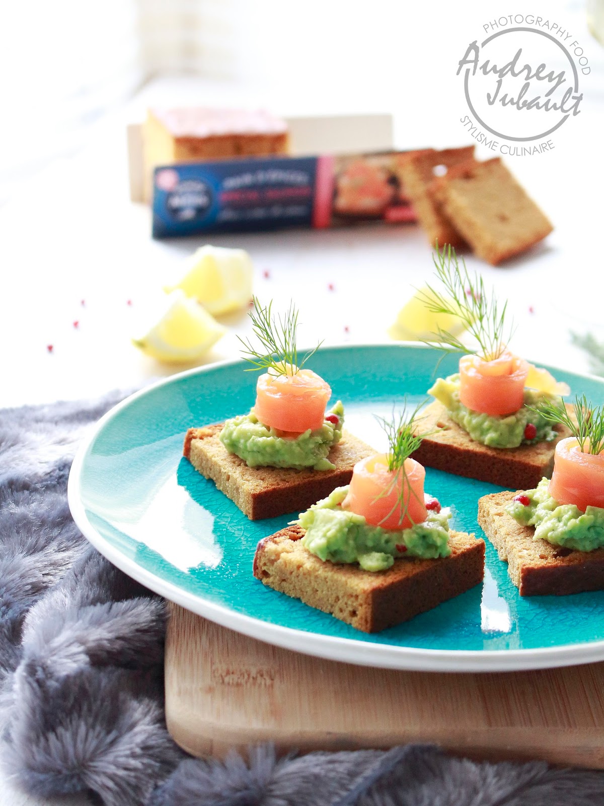 Ce petit amuse-bouche épatera vos invités par l'alliance du pain d'épices au citron, de l'avocat aux baies roses, de lamelles de saumon et d'aneth.