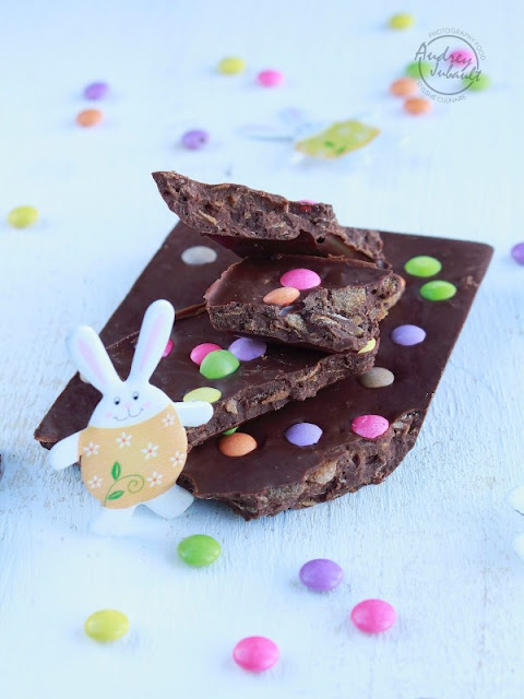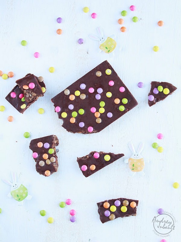 Vous pouvez laisser libre cours à votre imagination, remplacez les pastilles de couleurs par de la friture de chocolat, des petits oeufs de Pâques, des bonbons, des pépites de caramel, du pralin, des fruits secs, etc...