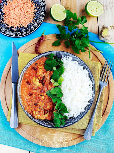 En ce début de semaine, je vous propose un repas léger mais délicieux: un Curry de lentilles corail et poulet fermier accompagné d'un peu de riz.