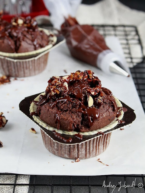 Une gourmandise bien alléchante que je vous propose aujourd'hui: des muffins au chocolat et praliné, nappés de chocolat fondu et de noisettes caramélisées.