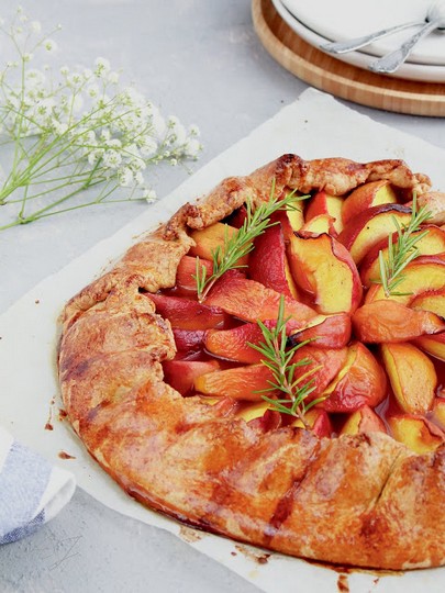 - Ajoutez les quartiers de pêches (n'oubliez pas d'enlever les branches de romarin) au centre, repliez les bords de pâte un peu sur les pêches.
