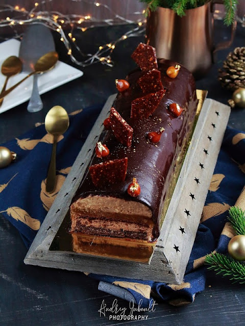Elle est composée d'un biscuit macaron au cacao et poudre de noisettes grillées, d'un croutillant au chocolat noir et crêpes dentelles, d'un caramel à se taper les fesses par terre, d'une mousse extra légère (niveau texture c'est whaouhhh !!) au chocolat au lait et praliné choco, d'un glaçage miroire (un peu plus épas que la normale et c'était complètement voulu car je souhaitais un aspect ultra gourmand du glaçage lorsque l'on y plonge sa petite cuillère).