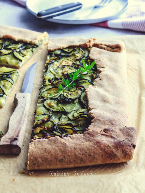 J'ai préparée une pâte brisée à base de 2 farines: farine de petite épeautre T70 et farine de blé T65 (elles sont plus complètes) et à laquelle j'ai rajoutée quelques herbes de Provence. Les courgettes et fromage de chèvre frais proviennent de producteurs locaux.