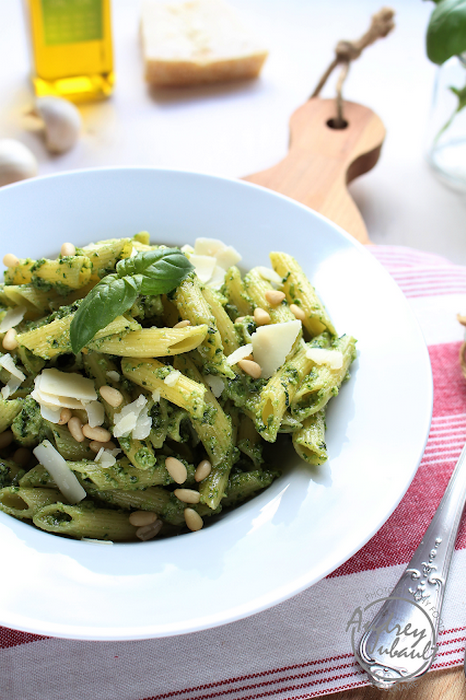 - Egouttez bien les pâtes, versez dans un grand saladier, ajoutez le pesto (réchauffé un peu), parsemez de pignons de pins et de copeaux de parmesan.