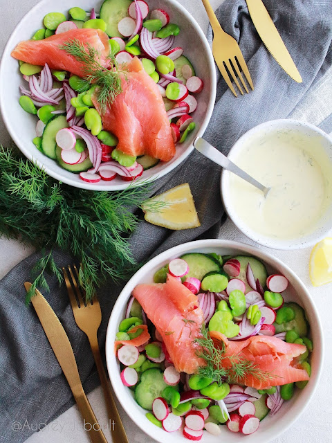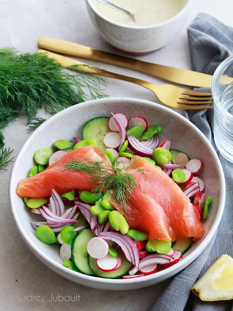 | Salade de concombre, radis, fèves et truite fumée sauce yaourt |