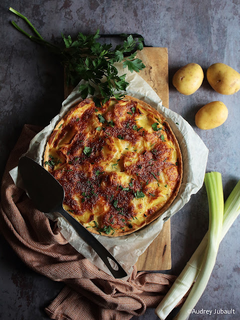 Elle est faite avec une pâte brisée maison et c'est bien meilleur et pas compliqué à préparer; des poireaux émincés très finement (ça passe tout seul pour les réticents de ce bon légume) et cuits avec un peu d'huile d'olive, des rondelles de pommes de terre pré-cuites, du jambon blanc et surtout un comté râpé avec un affinage d'au moins 6 voir 12 mois.