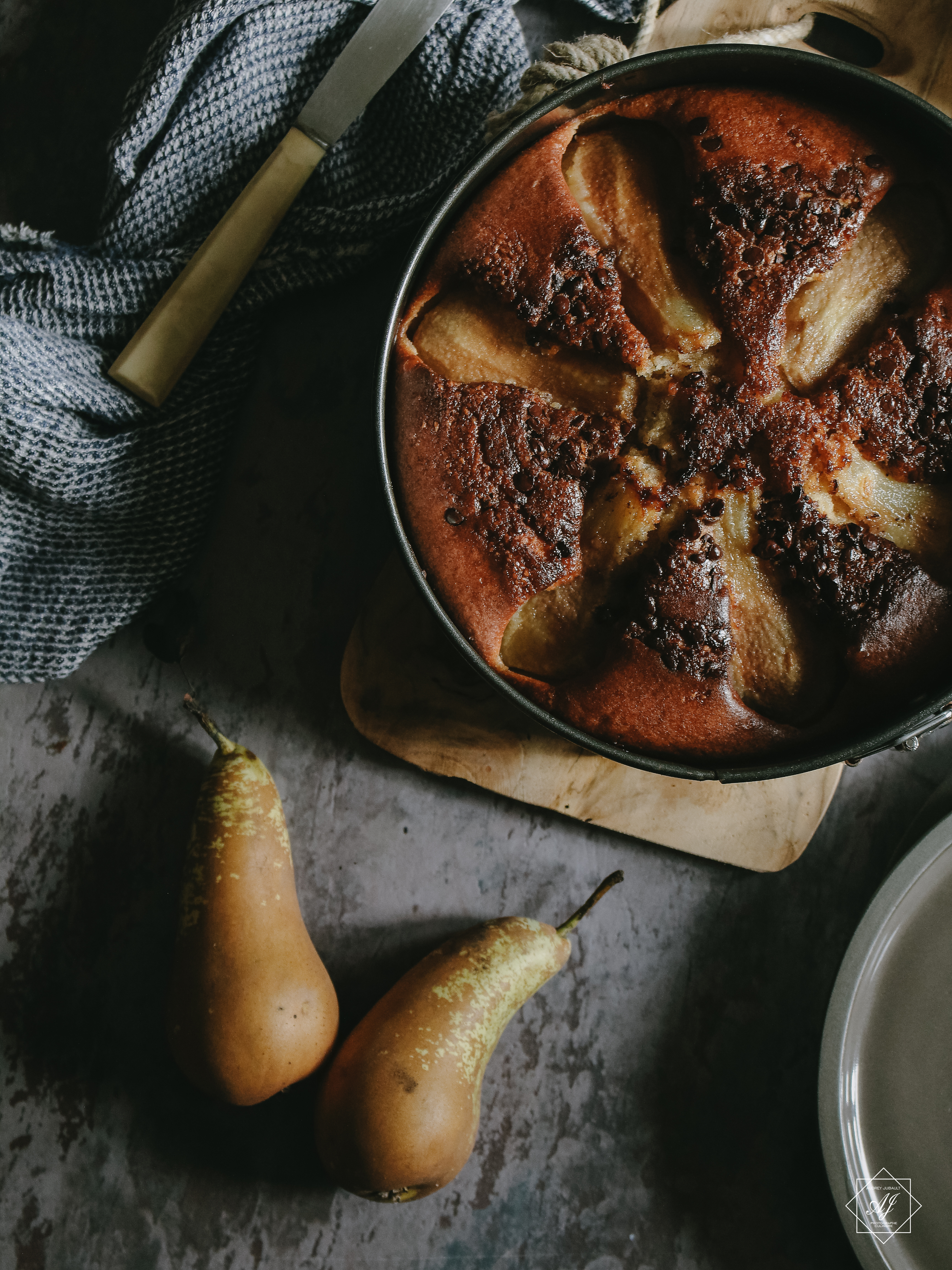 On a une base de moelleux faite avec du lait ribot. Le lait ribot est un lait fermenté et il apporte une texture extra moelleuse à vos gâteaux. On y ajoute une crème de noisettes (un peu comme dans les galettes des rois), quelques quartiers de poires et des pépites de chocolat.