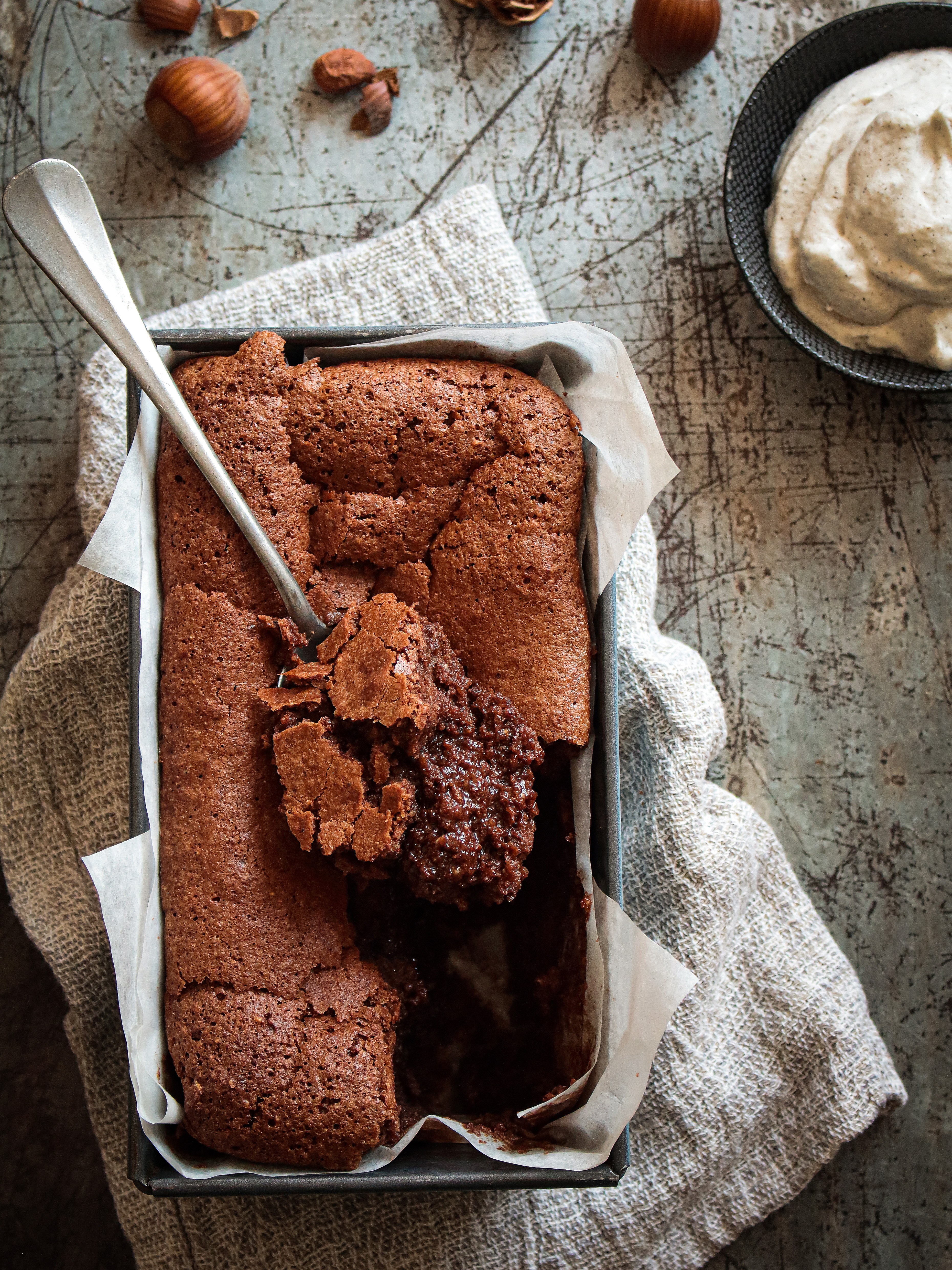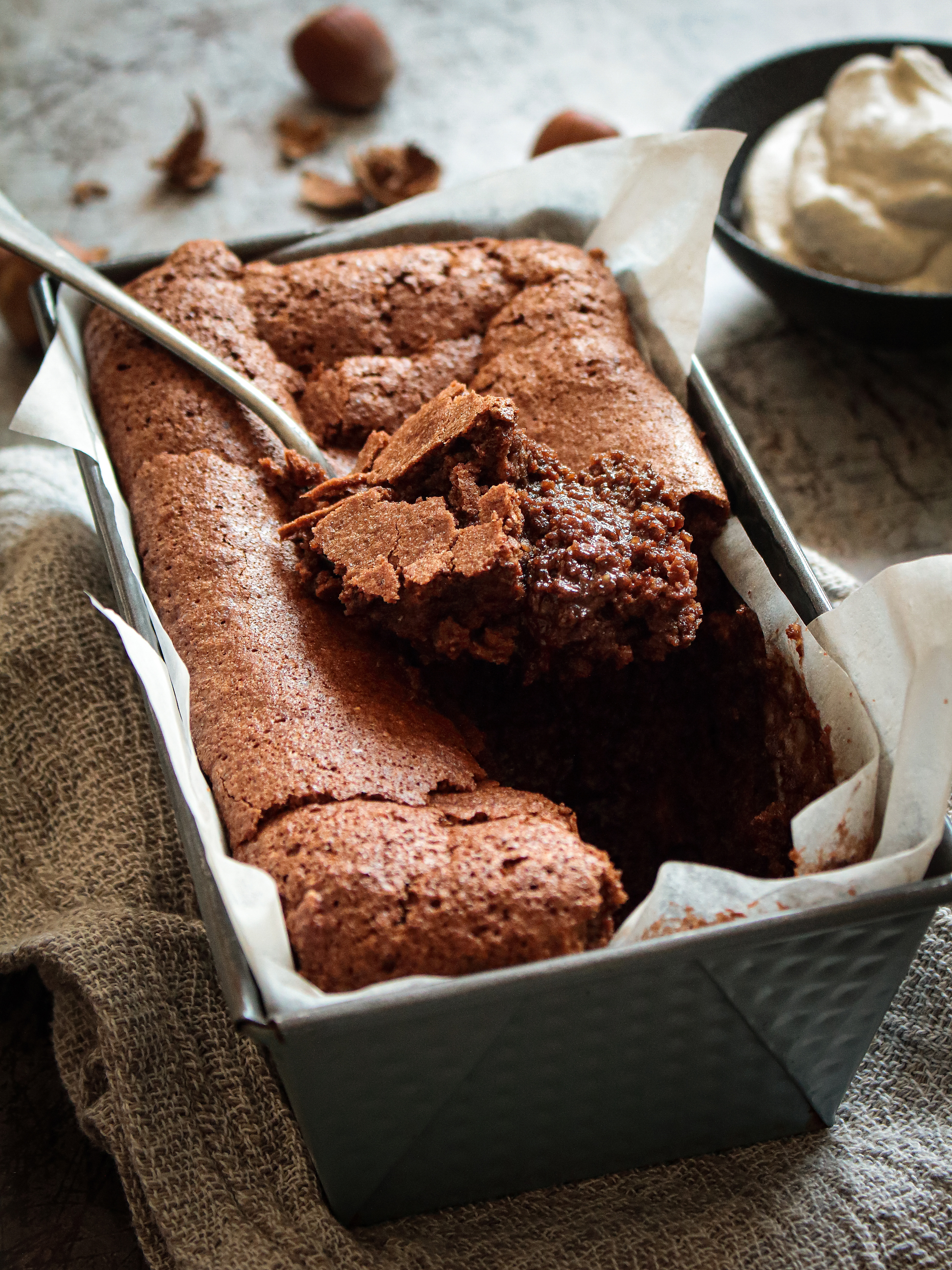- Chemiser un plat à cake de 20.5 x 12 cm de papier cuisson.