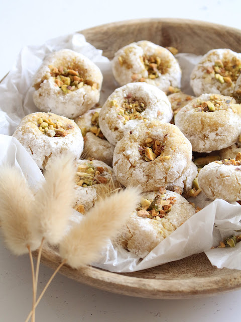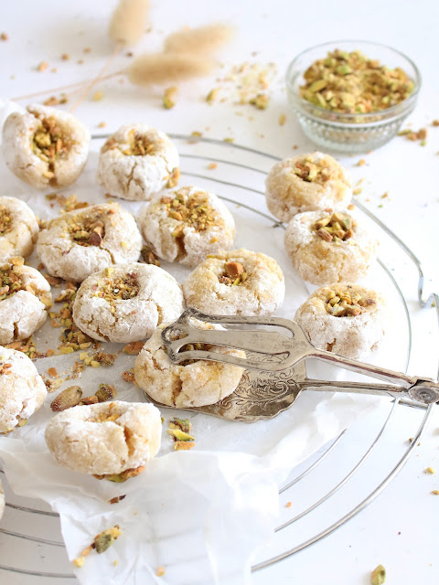 - Les poser sur une plaque recouverte de papier cuisson. Avec le bout d'un doigt, faire une légère empreinte puis y déposer des brisures de pistaches.